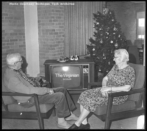 December 19, 1969. Mrs. Fannie Hanson and the oldest resident of Lakeview Manor, John H. Polglase, 85, enjoy color television. Santa came early to Lakeview Manor in Hancock and left this beautiful 23 inch Zenith Color TV with a note signed, “Merry Christmas to the residents of Lakeview Manor from Herman Gundlach; Industrial Piping, Inc.; and M & J Electric, Inc. The residents are truly grateful to the concerns for this generous gift and the thoughtfulness that came with it. [The two residents watch “The Virginian” in color.]